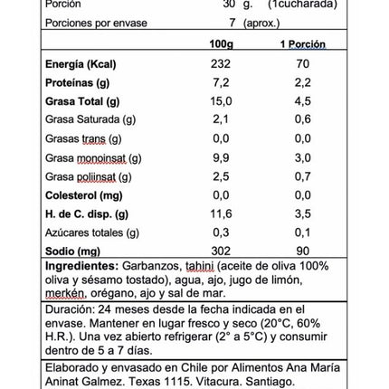 Ingredientes: Garbanzos, tahini (aceite de oliva 100% oliva y sésamo tostado), merkén, orégano, agua, jugo de limón, sal de mar, ajo y limón.