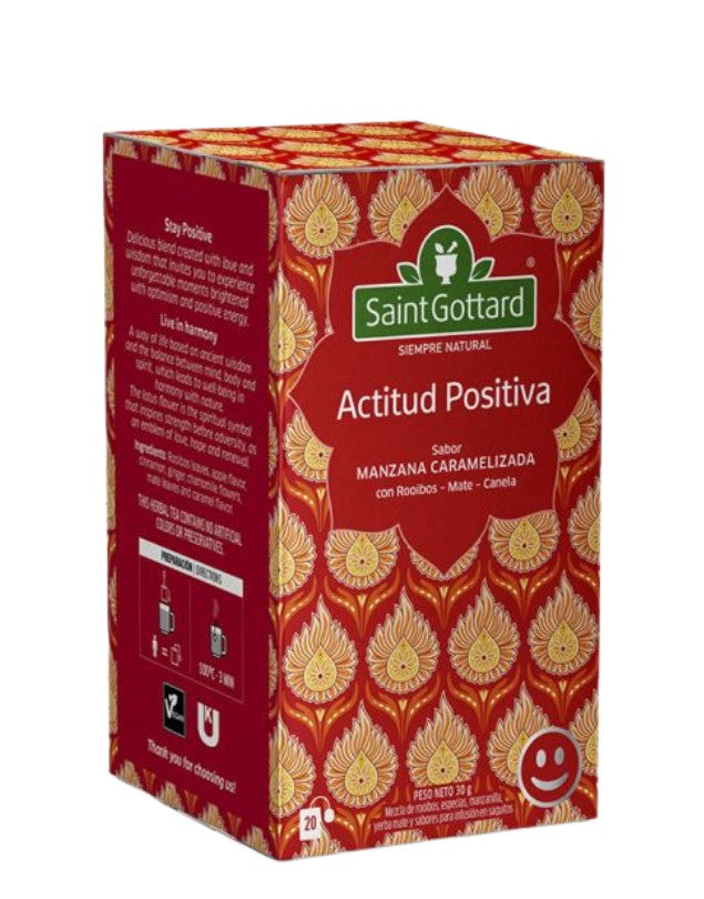 Infusión actitud positiva, marca Saint Gottard. 20 bolsas. Sabor manzana caramelizada con rooibos, mate y canela. Leer más...