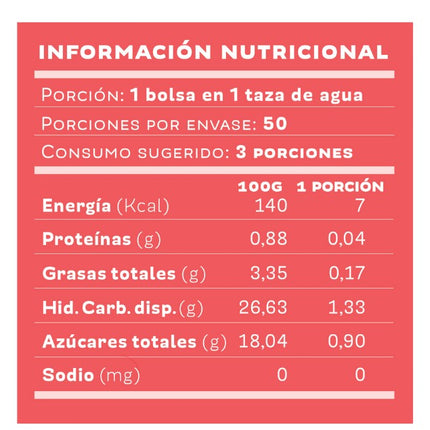 Preparación: Dejar reposar 2 a 3 minutos en agua recién hervida una bolsita de infusión, tapando la taza.