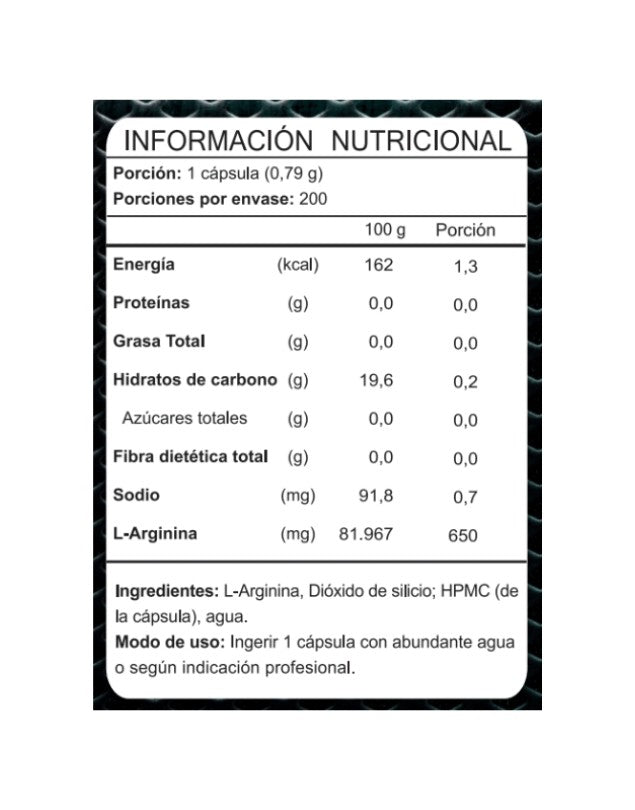 Ingredientes: L-Arginina, dióxido de silicio, HPMC de la cápsula, agua.