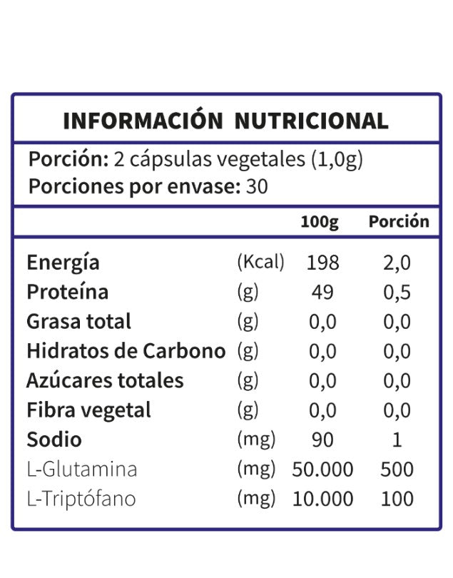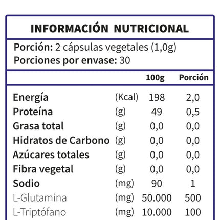 Ingredientes: L-glutamina, L-triptófano, HPMC de la cápsula, agua.