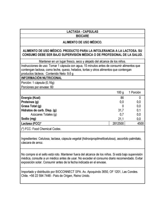 Lactasa Ezimas Digestivas, 60 cáps. BioCare. Enzima Lactasa Biocare es un complemento ideal para aquellas personas con dificultad en digerir la lactosa. Contiene 4500 FCC* de lactosa por capsula, dosis recomendada por la EFSA para tratar intolerancias a la lactosa y sus síntomas. Esta enzima es especialmente útil en caso de intolerancia a la lactosa y/o molestias digestivas, incluida la diarrea, al consumir productos lácteos.