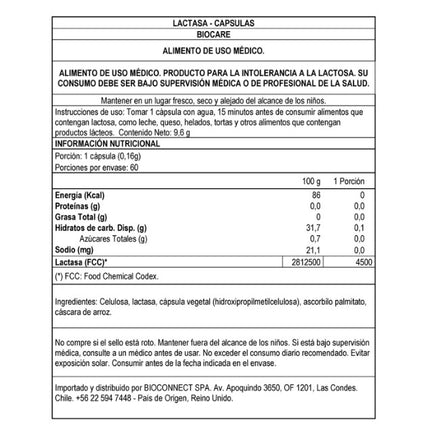 Lactasa Encimas Digestivas, 60 cáps. BioCare. Esta enzima es especialmente útil en caso de intolerancia a la lactosa y/o molestias digestivas al consumir productos lácteos. Contiene 4500 FCC de lactosa por capsula, dosis recomendada por la EFSA para tratar intolerancias a la lactosa y sus síntomas.