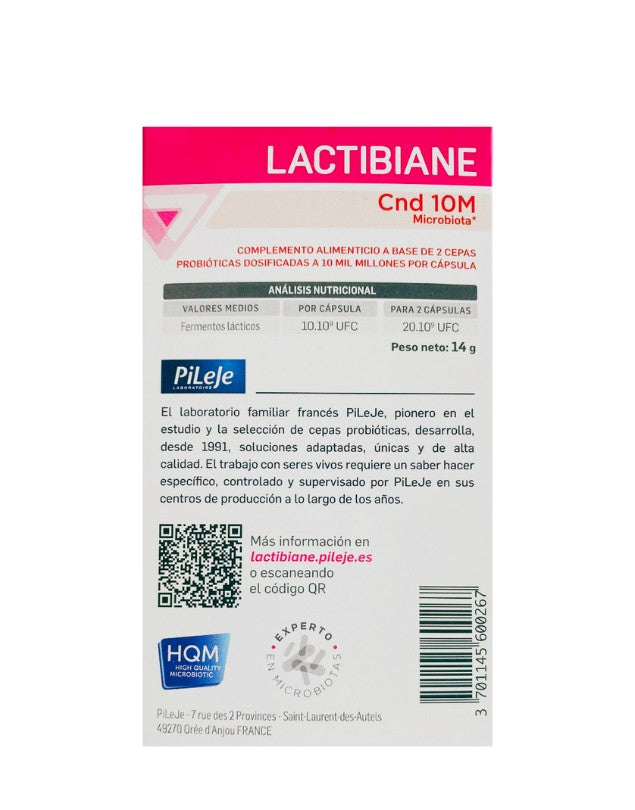 Lactibiane Cnd 10M, 30 caps. Pileje. Complemento alimenticio a base de 2 cepas microbióticas dosificadas a 10 mil millones por cápsula. Caja de 30 cápsulas - C.N. 192949.5