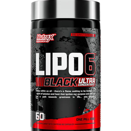 Lipo 6 Black Ultra Concentrate, 60 caps de Nutrex. Es un producto para deportistas con adición de cafeína aportada por los extractos de guaraná, cacao y cafeína como cafeína anhidra.