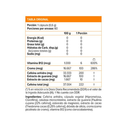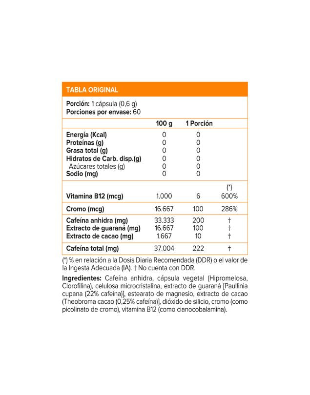 Es un producto para deportistas con adición de cafeína aportada por los extractos de guaraná, cacao y cafeína como cafeína anhidra, por lo cual se recomienda consumir un máximo de 2 cápsulas al día. Además, es suplementado en vitamina B12 (como cianocobalamina) y en cromo (como picolinato de cromo).