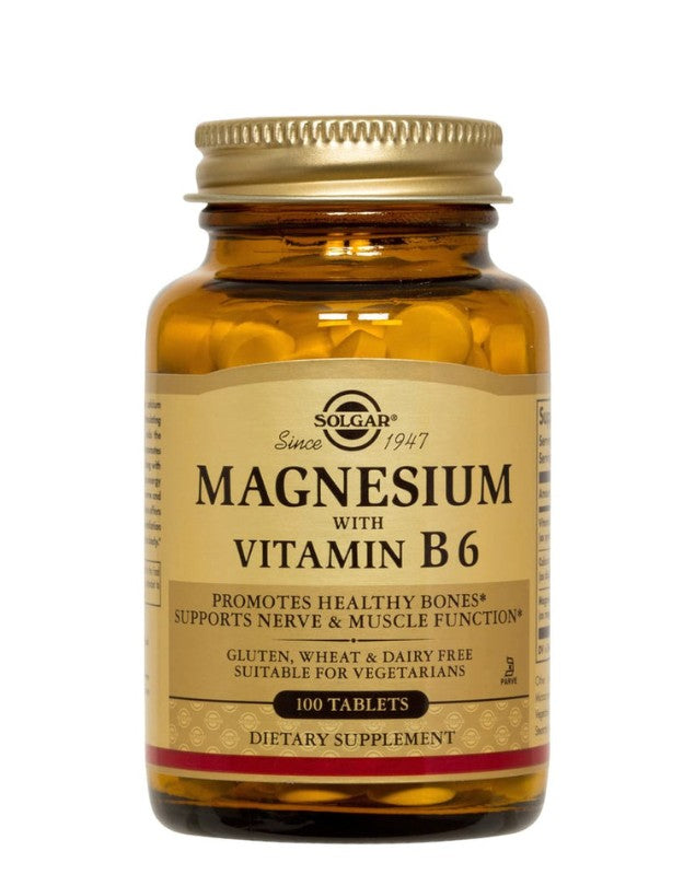 Magnesio + Vitamina B6, 100 tab. Marca Solgar. Favorece la absorción de calcio en los huesos. Ayuda a prevenir o disminuir la aparición de calambres musculares. Contiene Vitamina B6, contribuyendo a una óptima formación de masa muscular. Producto apto para veganos. Leer más...