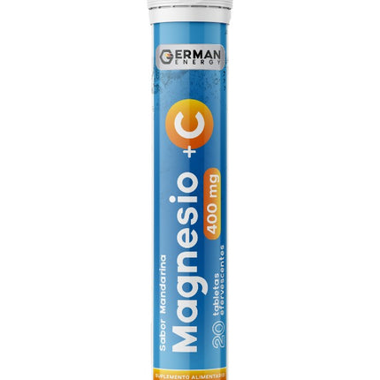 Magnesio + Vitamina C, 400 mg, 20 tabletas. German Energy. Suplemento alimentario efervescente con aporte de Magnesio y vitamina C, sabor mandarina. Refuerza la salud muscular y el sistema cardiovascular. Apto para Veganos y sin gluten.