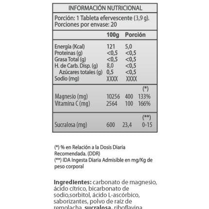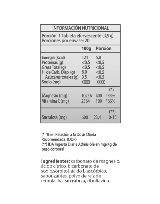 Ingredientes: Carbonato de magnesio, ácido cítrico, bicarbonato de sodio, sorbitol, ácido L-ascórbico, saborizante artificial sabor mandarina, polvo de raíz de remolacha, sucralosa, colorante riboflavina.
