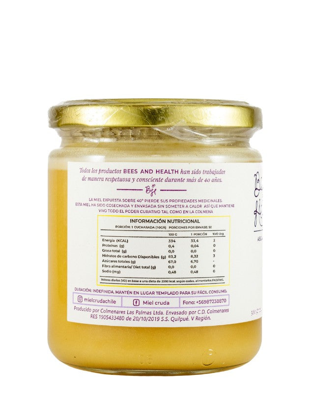 Miel cruda y sin filtrar de Tiaca, 500 gr. Bees & Health. Esta variedad de miel proviene de la floración del árbol TIACA, nativo del Sur de Chile. Libre de gluten.