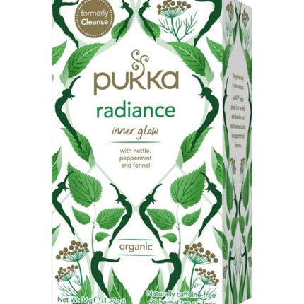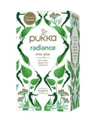 Mix de Infusión Radiance, 20 un. Pukka. Acompaña tus días con una taza fresca llena de hierbas antiinflamatorias como la ortiga y el hinojo, refrescada con toques de menta y aloe vera. Con esta infusión digestiva resplandece desde adentro hacia afuera.