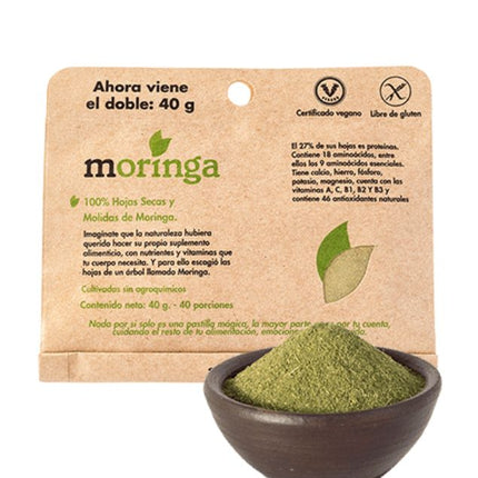 Moringa, 40g. Dulzura Natural. El 27% de la hoja de Moringa está compuesto por proteína. De los 20 aminoácidos que el cuerpo necesita a diario para vivir, 9 son esenciales y el cuerpo no los produce por sí solo. La Moringa contiene 18 de ellos y dentro de estos están los 9 aminoácidos esenciales.