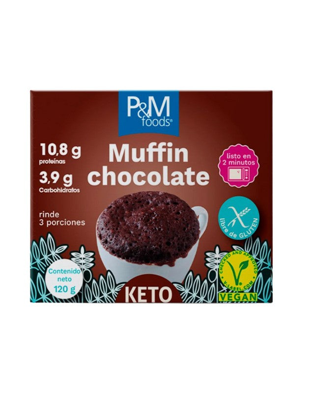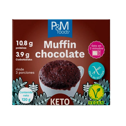 Muffin instantáneo keto chocolate, 120gr. P&M Foods. Mezcla lista para muffin Keto sabor chocolate. Prepáralo fácil, en microondas en un minuto y medio. 212 calorías por porción de 110 gramos. Rinde 3 muffin. Vegano. Sin gluten.