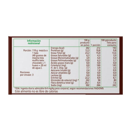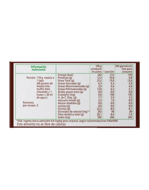 Ingredientes: Harina de linaza, eritritol, harina de coco, cacao en polvo, polvos de horneo (bicarbonato de sodio, pirofosfato ácido de sodio, fosfato monocálcico), saborizante chocolate, estevia.