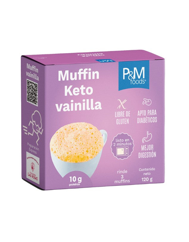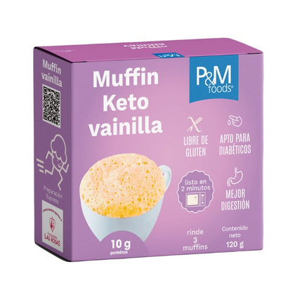 Muffin instantáneo keto vainilla, 120gr. P&M Foods. Mezcla lista para muffin Keto sabor vainilla. Prepáralo fácil, en microondas en un minuto y medio. 210 calorías por porción de 110 gramos. Rinde 3 muffin.
