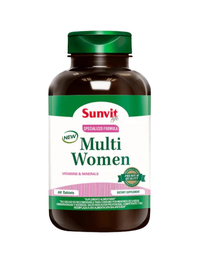 Multi Women, Multivitamínico, 60 tabs. marca Sunvit. Multi Women es un multivitamínico sugerido para mujeres con el fin de aportar vitaminas, minerales y nutrientes esenciales para ellas.
