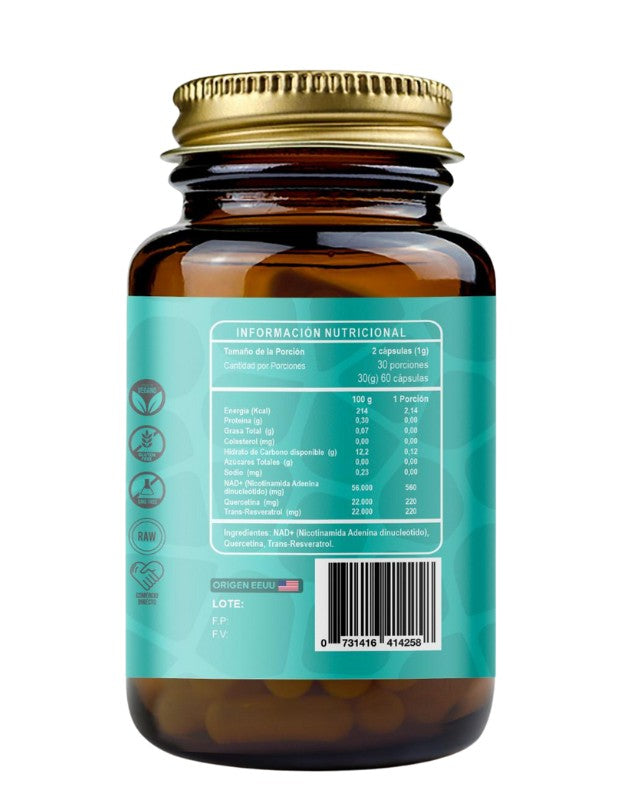 Energía Celular y Protección Antioxidante Este suplemento combina tres poderosos ingredientes: NAD+, Quercetina y Resveratrol, para mejorar la función celular, aumentar los niveles de energía y proporcionar protección antioxidante. Ideal para quienes buscan promover la longevidad, la salud cardiovascular y un sistema inmunológico fuerte.
