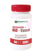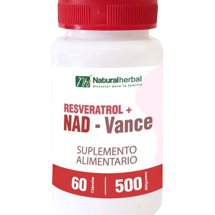 NAD, Vance, Resveratrol 500mg, 60 caps. Natural Herbal.La combinación de NAD⁺ (Nicotinamida Adenina Dinucleótido) y Resveratrol es una de las estrategias más estudiadas en longevidad.