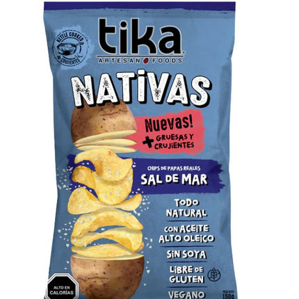 Nativas Chips Papas Reales Sal de Mar, 150 gr. Tika. Las Tika Nativas sabor Sal de Mar ofrecen la combinación perfecta de sal marina y textura crujiente. Ideales para quienes disfrutan de sabores simples pero deliciosos. Perfectas como snack o para acompañar platos gourmet.