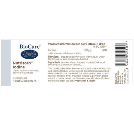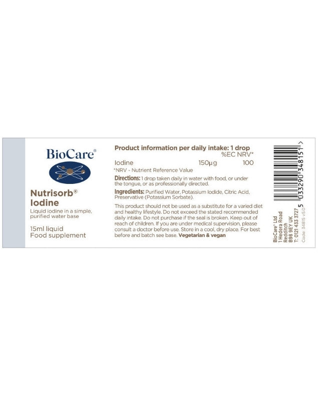 Nutrisorb Yodo Liquido, 15ml. BioCare. Nutrisorb Yodo, proporciona yoduro de potasio altamente disponible en una base simple de agua purificada. Apto Veganos.
