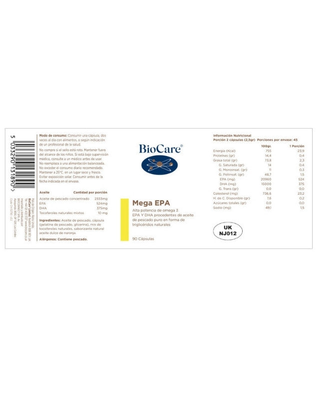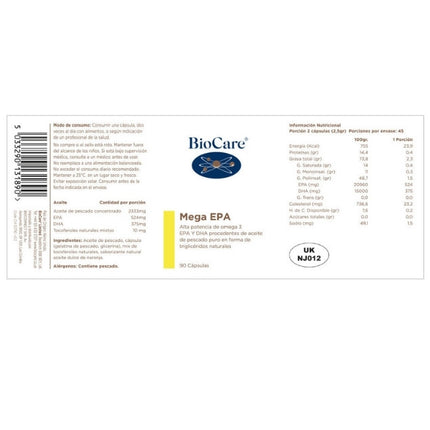 Omega 3 Mega EPA Aceite de Pescado, 90 cáps. BioCare. Cápsula blanda de alta potencia que contiene ácidos grasos Omega-3 (EPA y DHA) procedentes de aceite de pescado puro (sardinas y anchoas).