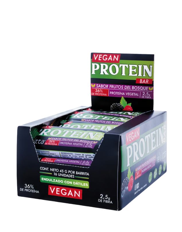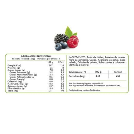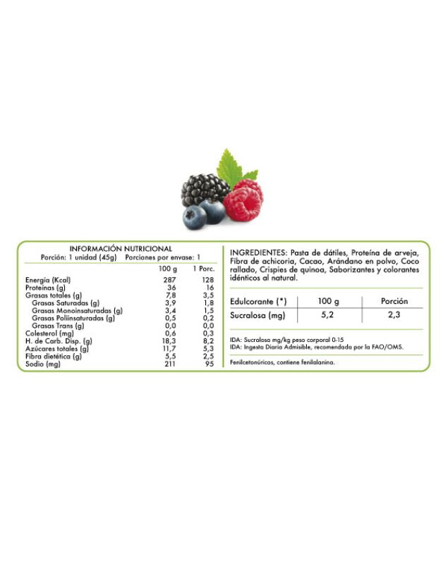 Pack 16 Barras, Whey Protein Bar, Frutos Del Bosque, 45g. Es una barra de proteína elaborada a partir de dátiles, aislado de proteína de suero de leche, coco en polvo, crispies de quinoa y saborizantes idénticos al natural.