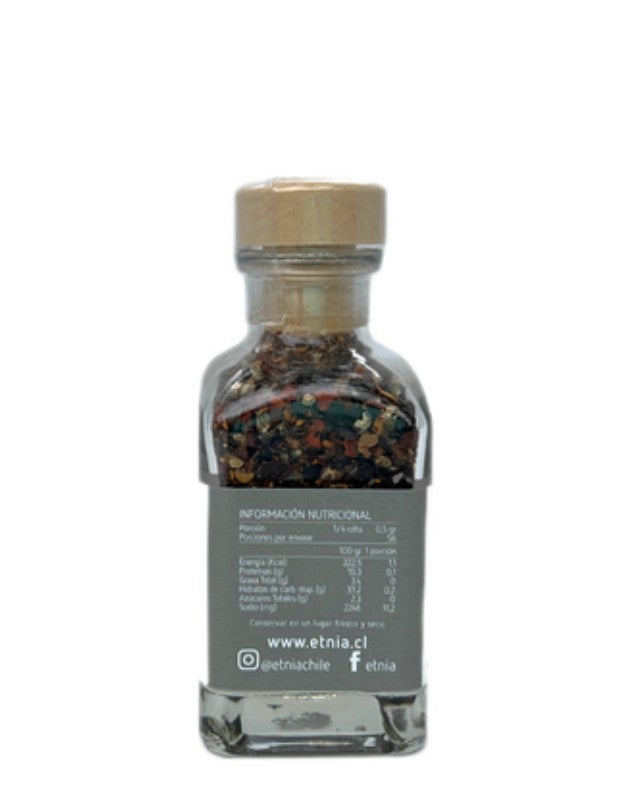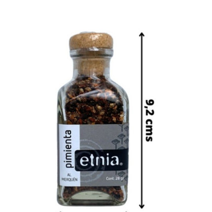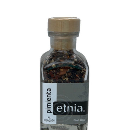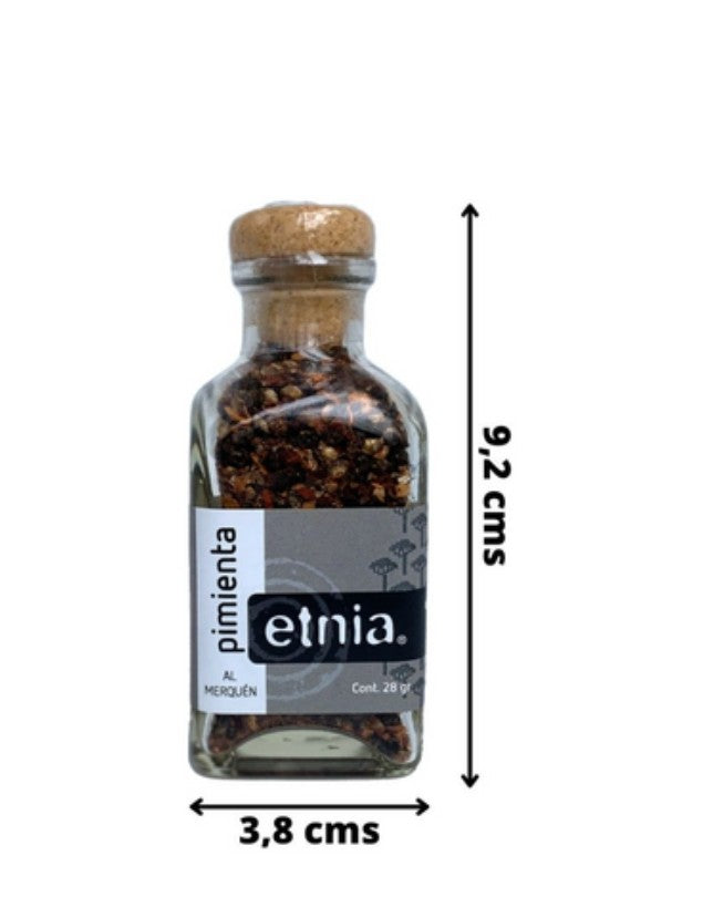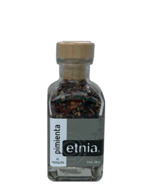 Pimienta Al Merquén, 28 gr. Etnia. Pimienta negra granulada mezclada con merkén. Etnia, tiene elaboración de productos que son parte de la gastronomía chilena, tiene sabores autóctonos que ponen en un lugar de excelencia a Chile. Además es una marca que trabaja bajo el concepto de comercio justo con productores indígenas, micro y pequeñas empresas a lo largo de todo el país.