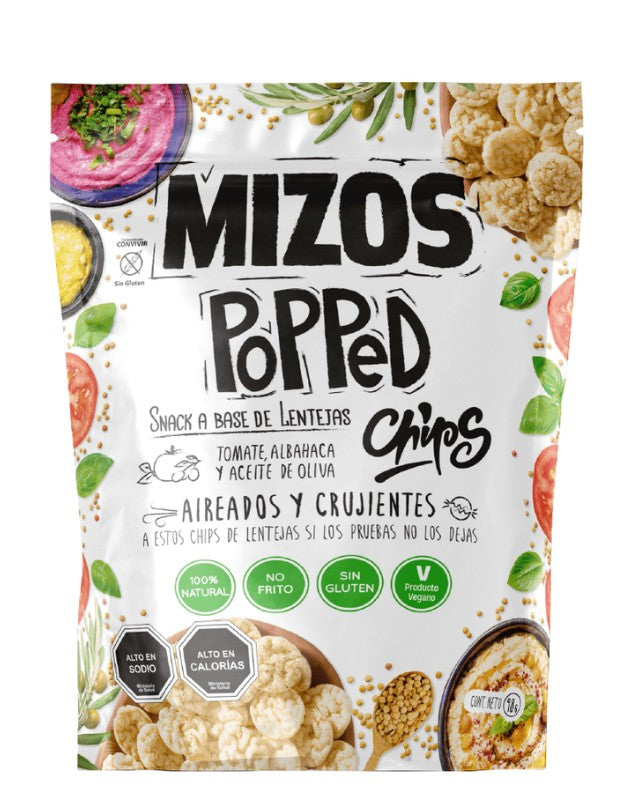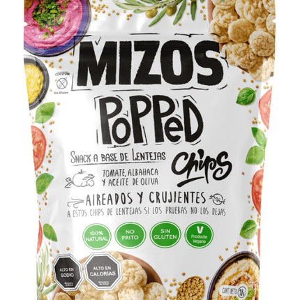 Popped chips de lentejas con tomate y albahaca , 98 gr. Mizos. Snack aireado y crujiente en base a lentejas, saborizado con tomate, albahaca y aceite de oliva. Con ingredientes naturales y no frito. Ideal para picoteos y aperitivos acompañados de ricas salsas y dips. Formato Familiar para compartir.