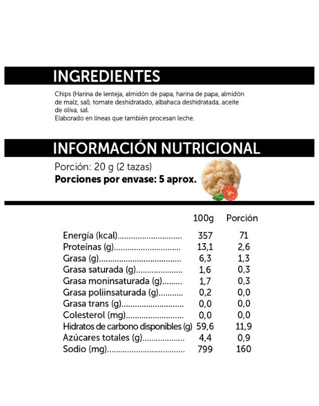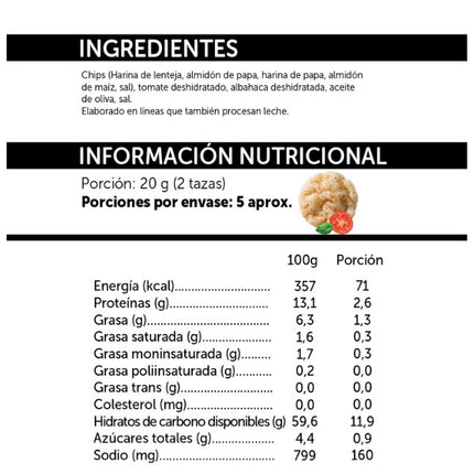 INGREDIENTES Chips (Harina de lenteja, almidón de papa, harina de papa, almidón de maíz, sal), tomate deshidratado, albahaca deshidratada, aceite de oliva, sal.