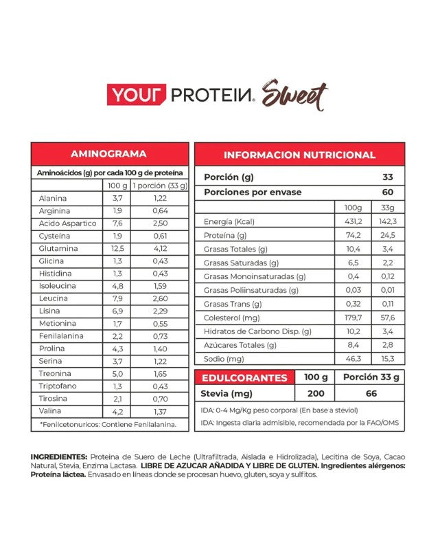 Proteina en Polvo, Cacao, 1.32 kg, 2.9 lb. Your Protein. YPTN Sweet Cacao, es realmente deliciosa, suave e increíble en aroma y sabor. Tienen un sabor muy distinto a las clásicas proteínas endulzadas con azúcar o sucralosa, además de diferenciarnos por un sabor suave, el cual es distintivo ya que nuestro saborizante es realmente natural del cacao, y además están endulzadas con Stevia. Uno de los edulcorantes más naturales y sanos existentes en la actualidad. Lo rico de nuestras Your Protein Sweet es que tienen un sabor muy suave al paladar, pero también te permiten realizar un simple shake para llevarlo a todas partes, y ademas puedes continuar haciéndote exquisitas preparaciones que quedaran con un toque de su sabor natural a cacao. Your Protein Sweet es fiel reflejo de nuestra identidad, VERSATILIDAD.