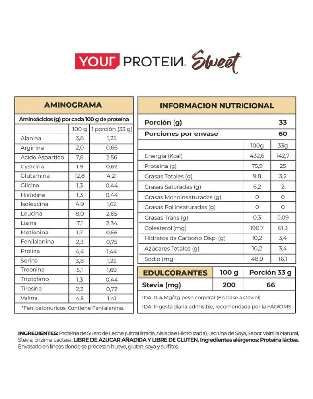 YPTN Sweet Vainilla, es realmente deliciosa, suave e increíble en aroma y sabor. Tienen un sabor muy distinto a las clásicas proteínas endulzadas con azúcar o sucralosa, además de diferenciarnos por un sabor suave, el cual es distintivo, ya que nuestro saborizante es realmente natural a vainilla, y además están endulzadas con Stevia. Uno de los edulcorantes más naturales y sanos existentes en la actualidad. Lo rico de nuestras Your Protein Sweet es que tienen un sabor muy suave al paladar, pero también te permiten realizar un simple shake para llevarlo a todas partes, y además puedes continuar haciéndote exquisitas preparaciones que quedaran con un toque de su sabor natural a vainilla. Your Protein Sweet es fiel reflejo de nuestra identidad, versatilidad.