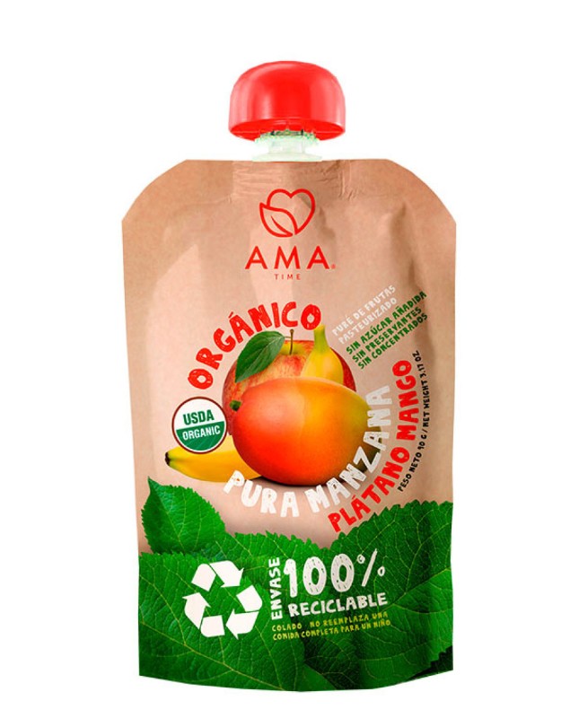 Puré de Manzana Plátano y Mango 100% orgánico, 90 gr. Ama Time. Sin preservantes, ni saborizantes Envase reciclable.