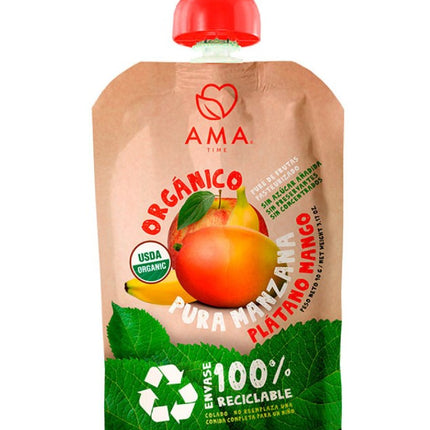Puré de Manzana Plátano y Mango 100% orgánico, 90 gr. Ama Time. Sin preservantes, ni saborizantes Envase reciclable. VENCIMIENTO: 07-11-2025