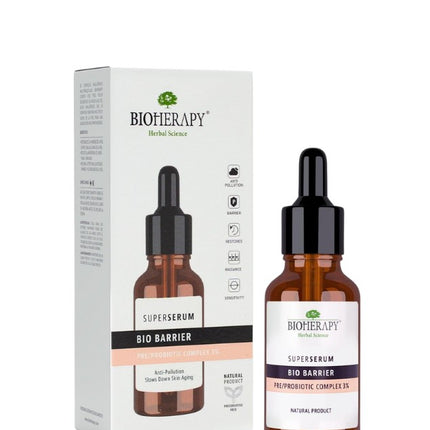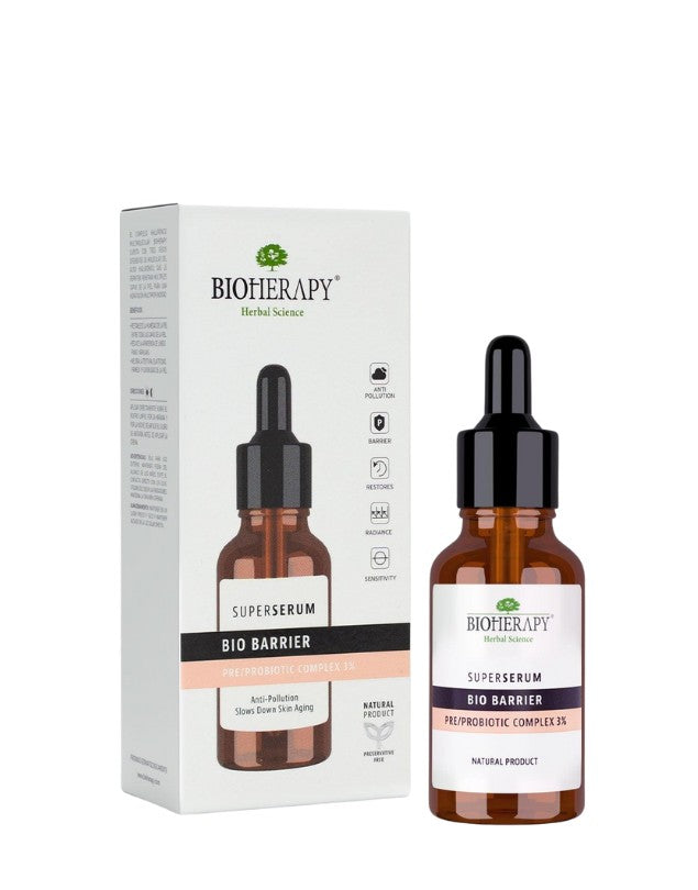 Serum Bio barrera pre probiótico. Bioherapy. Antipolución y ralentiza el envejecimiento de la piel. Esta fórmula, potenciada con enzimas pre / probióticas, ralentiza los signos del envejecimiento estabilizando el sistema inmunológico de la piel y protegiéndola contra las influencias ambientales negativas.