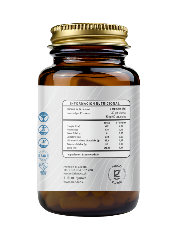 Shilajit, 500mg, 60 caps. Ri&Co. ¿Qué es el Shilajit? Desde lo más alto del Himalaya, hasta tu bienestar diario. El Shilajit es una resina natural que se forma durante siglos en las grietas de montañas como el Himalaya. Leer más...