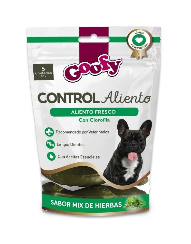 Los snacks control aliento Goofy para perros están científicamente desarrollados por veterinarios para controlar efectivamente el mal aliento de su mascota. Contiene clorofila y aceites esenciales, antibacterianos naturales que actúan desde el interior del sistema digestivo para un aliento fresco.  Ideal para todo tipo de perros y de todas las razas.