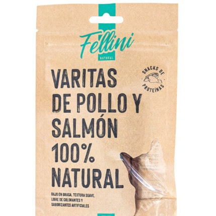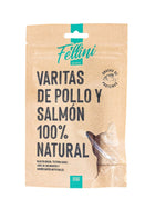 Snack varitas pollo y salmón para gatos, 50g. Fellini. Snack 100% natural con más de 70% proteína de pollo y salmón, sin saborizantes artificiales adicionados. Varitas con textura suave, fáciles de masticar. Leer más...