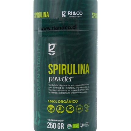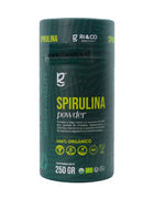 Spirulina en Polvo, 250g. Ri&Co. La spirulina es una microalga azul-verde que es una rica fuente de proteínas, vitaminas, minerales y antioxidantes, Tiene beneficios nutricionales y se utiliza como suplemento dietético. Vegano. Libre de gluten.