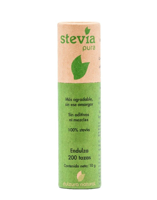 Stevia Pura, 10 g. Dulzura Natural. Endulzante natural en polvo obtenido utilizando agua, nanofiltración y evaporación por aire caliente. Su sabor es llamativamente dulce debido a que el proceso de nanofiltración se encarga de remover aún más el componente amargo de la stevia, dejando en mayor concentración el componente dulce de la hoja.