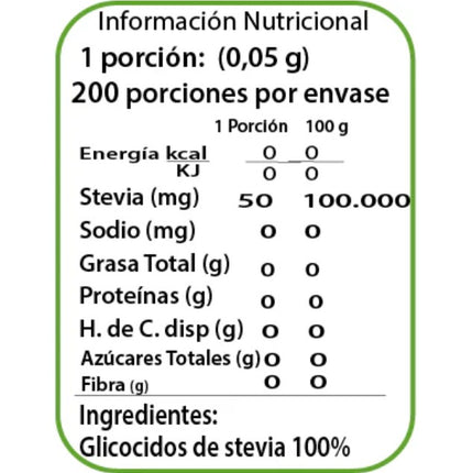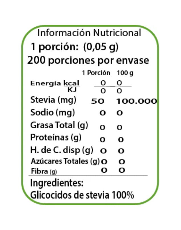 Stevia Pura, 10 g. Dulzura Natural. Endulzante natural en polvo obtenido utilizando agua, nanofiltración y evaporación por aire caliente. Su sabor es llamativamente dulce debido a que el proceso de nanofiltración se encarga de remover aún más el componente amargo de la stevia, dejando en mayor concentración el componente dulce de la hoja. Leer más...