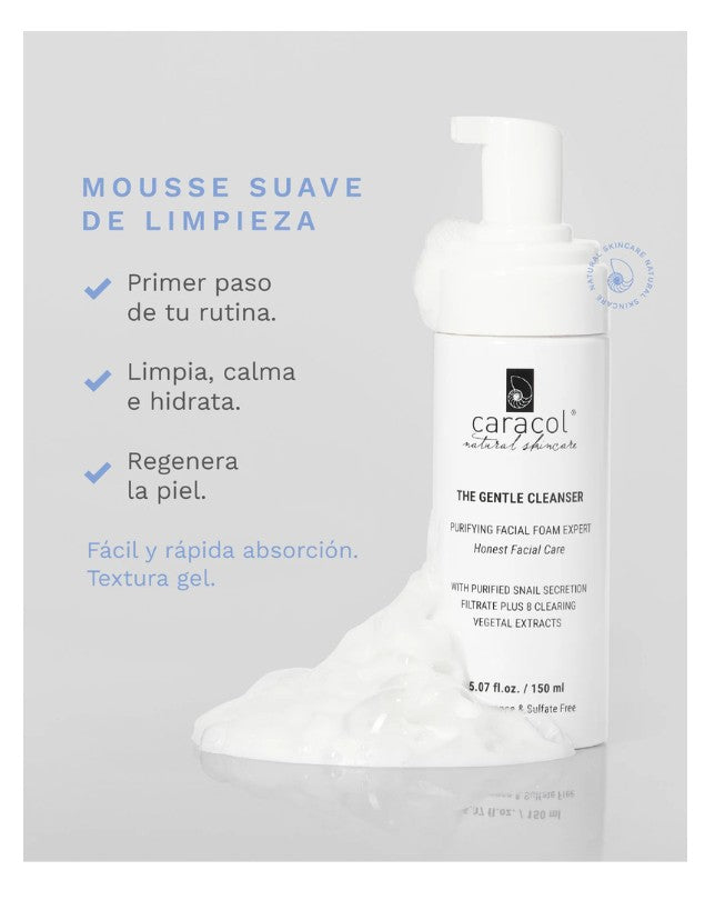 Suave Mousse Limpieza, 150 ml. Caracol Natural Skincare. Limpia, calma, hidrata y regenera. Todo tipo de piel. Suave mousse de limpieza para la cara y el cuello, es un paso esencial en el cuidado diario de su belleza, este ayuda a múltiples propósitos como limpiar, hidratar y regenerar la piel.
