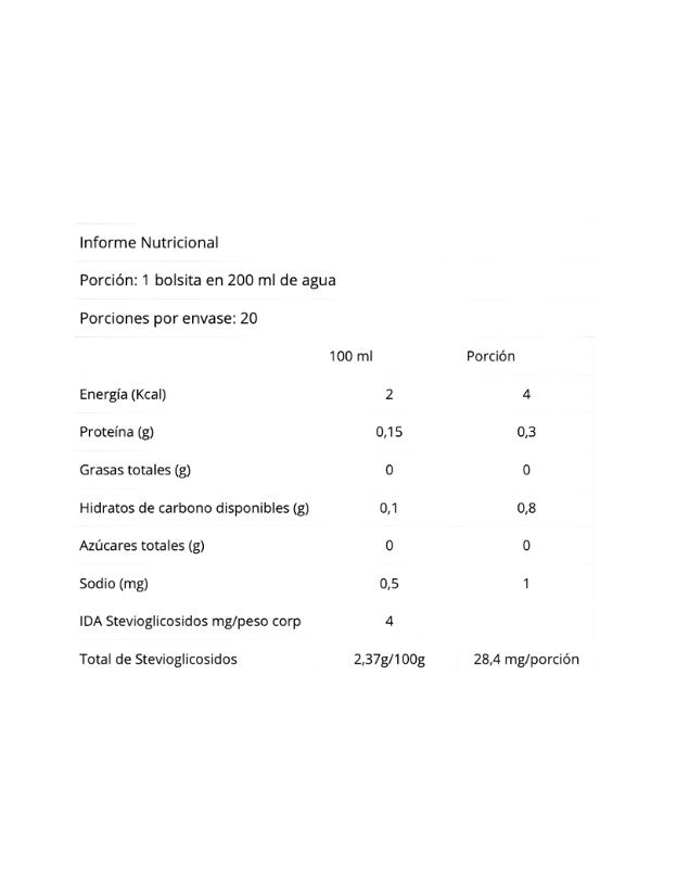 Ingredientes: Tilo, eucaliptus, menta piperita, poleo, toronjil, hojas de stevia. Cada caja contiene 20 bolsitas Peso Neto 40 gr