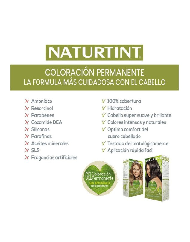 El tinte sin amoniaco de Naturtint, respeta al máximo la salud del cabello. Su innovadora y exclusiva fórmula en gel, enriquecida con ingredientes naturales, está libre de Amoníaco, Resorcinol, Parabenes, Cocamide Dea, Siliconas, Parafinas, Aceites minerales, SLS y Fragancias artificiales.