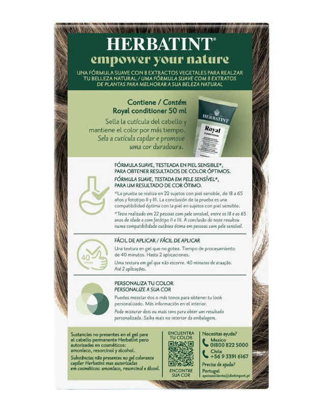 Herbatint es la coloración gel permanente que contiene 8 extractos vegetales biológicos (Producto Vegano) y cubre el 100% de las canas, brindando un resultado natural e intenso, lleno de reflejos. Tu cabello recupera brillo y vitalidad, presentándose más natural que nunca. Además, nuestro producto no es testeado en animales y está libre de amoniaco, parabenos, tolueno, resorcinol y metales como plomo, aluminio o níquel. ¡Explora nuestra gama de colores Herbatint y encuentra tu tono perfecto hoy mismo!