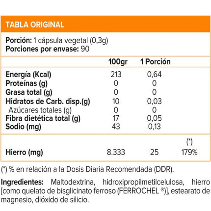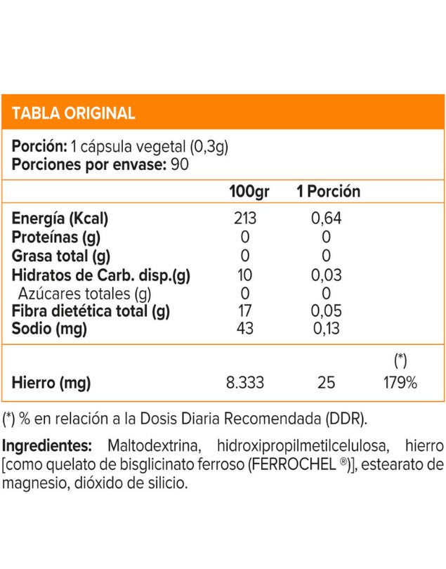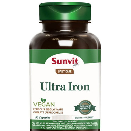 Ultra Iron, 90 caps, marca Sunvit. Promueve la producción de glóbulos rojos normales y favorece la utilización de la energía. Esta formulado con hierro en forma de bisglinato (FERROCHEL®), una forma química avanzada suave para el estómago y que posee muy buena absorción. Ultra Iron es el suplemento nutricional necesario para las personas con anemia y personas con dieta vegetariana y/o vegana.