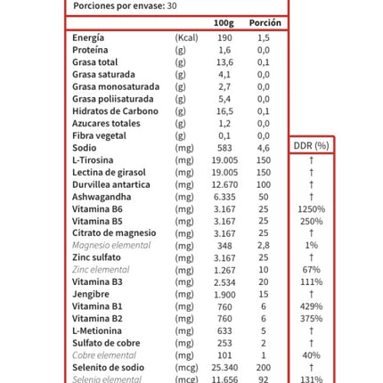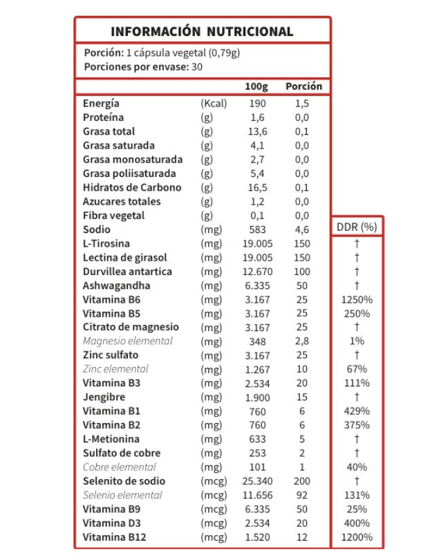 Ingredientes: L-tirosina, lecitina de girasol, Durvillea antarctica, Ashwagandha, Vitamina B6 (piridoxina), Vitamina B5 (ácido pantoténico), Citrato de magnesio, Vitamina B3 (niacina), Zinc sulfato, Jengibre officinalis, Vitamina B1 (tiamina), Vitamina B2 (riboflavina), L-metionina, Sulfato de cobre, Selenito de sodio, Vitamina B9 (ácido fólico), Vitamina D3 (colecalciferol), HPMC de la cápsula, agua.