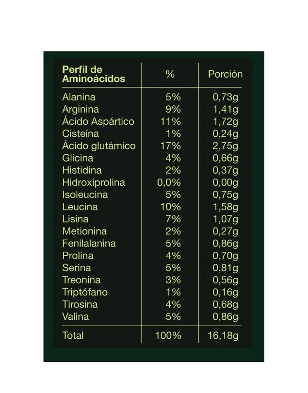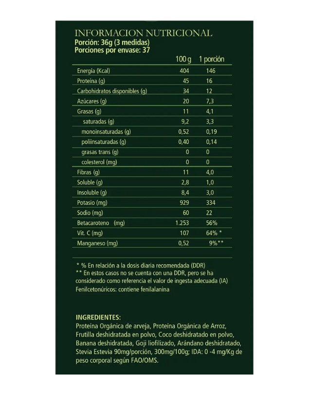 Ingredientes: Proteína Orgánica de arveja, Proteína Orgánica de Arroz, Frutilla deshidratada en polvo, Coco deshidratado en polvo, Banana deshidratada, Goji liofilizado, Arándano deshidratado, Stevia Estevia 90mg/porción, 300mg/100g; IDA: 0 -4 mg/Kg de peso corporal según FAO/OMS.