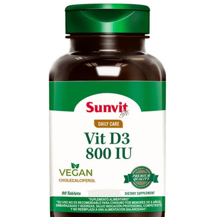 Vitamina D3 800 IU, 90 tabs. Marca Sunvit. La Vitamina D, fortalece la salud del sistema inmune y contribuye a mantener los huesos y dientes fuertes. También mejora la absorción de Calcio y Fósforo. Apto para veganos.