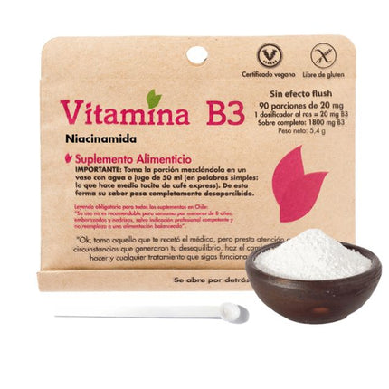 (Niacinamida), y la mezclamos con un poco de calcio ( Carbonato de Calcio) de origen mineral que ayuda a proteger y a dosificar la vitamina. No contiene ningún aditivo o químico adicional. Vegano y libre de gluten.