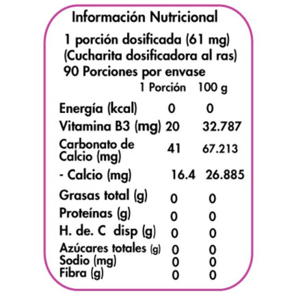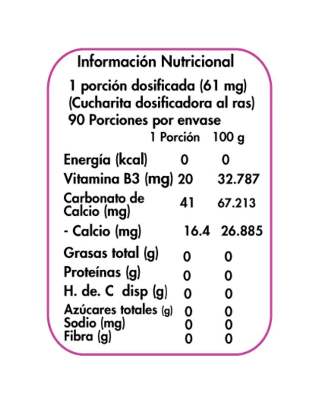 Ingredientes: Vitamina B3 (Niacinamida), Calcio como carbonato de calcio